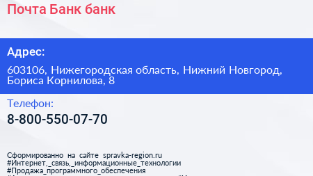 Почта Банк, банк по адресу 603106, Нижегородская область, Нижний Новгород, Бориса Корнилова, 8 в дальнейшем Организация, размещена в следующих категориях: