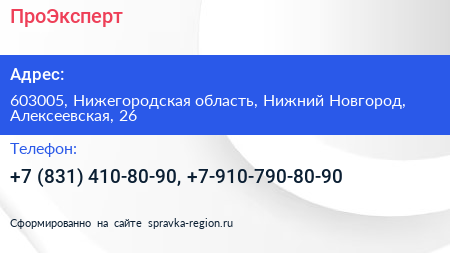 ПроЭксперт по адресу 603005, Нижегородская область, Нижний Новгород, Алексеевская, 26 в дальнейшем Организация, размещена в следующих категориях: