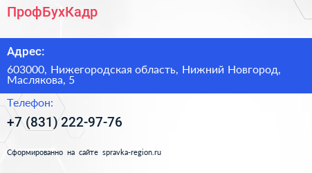 ПрофБухКадр по адресу 603000, Нижегородская область, Нижний Новгород, Маслякова, 5 в дальнейшем Организация, размещена в следующих категориях: