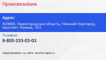 Промсвязьбанк по адресу 603004, Нижегородская область, Нижний Новгород, проспект Ленина, 111 в дальнейшем Организация, размещена в следующих категориях: