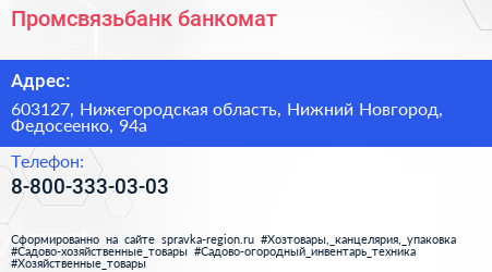 Промсвязьбанк, банкомат по адресу 603127, Нижегородская область, Нижний Новгород, Федосеенко, 94а в дальнейшем Организация, размещена в следующих категориях: