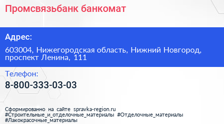 Промсвязьбанк, банкомат по адресу 603004, Нижегородская область, Нижний Новгород, проспект Ленина, 111 в дальнейшем Организация, размещена в следующих категориях: