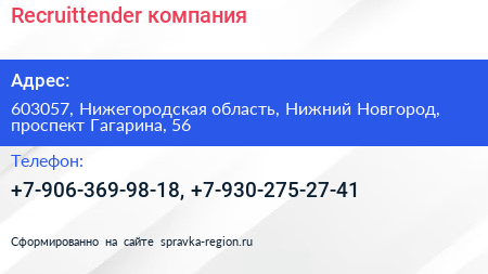 Recruittender, компания по адресу 603057, Нижегородская область, Нижний Новгород, проспект Гагарина, 56 в дальнейшем Организация, размещена в следующих категориях: