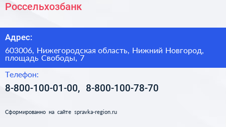 Россельхозбанк по адресу 603006, Нижегородская область, Нижний Новгород, площадь Свободы, 7 в дальнейшем Организация, размещена в следующих категориях: