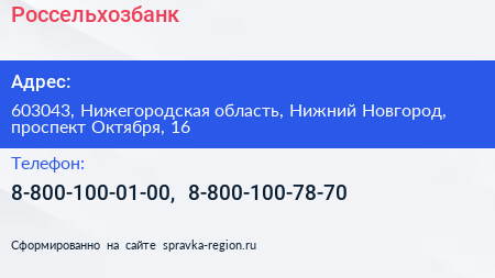 Россельхозбанк по адресу 603043, Нижегородская область, Нижний Новгород, проспект Октября, 16 в дальнейшем Организация, размещена в следующих категориях: