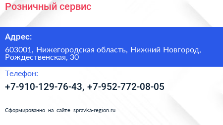 Розничный сервис по адресу 603001, Нижегородская область, Нижний Новгород, Рождественская, 30 в дальнейшем Организация, размещена в следующих категориях: