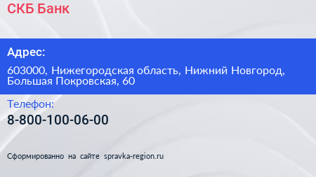СКБ-Банк по адресу 603000, Нижегородская область, Нижний Новгород, Большая Покровская, 60 в дальнейшем Организация, размещена в следующих категориях: