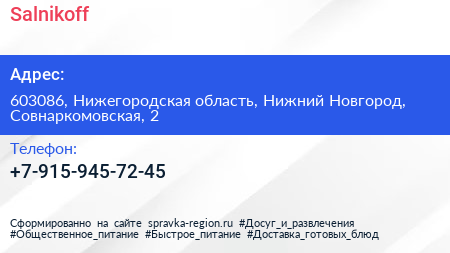 Salnikoff по адресу 603086, Нижегородская область, Нижний Новгород, Совнаркомовская, 2 в дальнейшем Организация, размещена в следующих категориях: