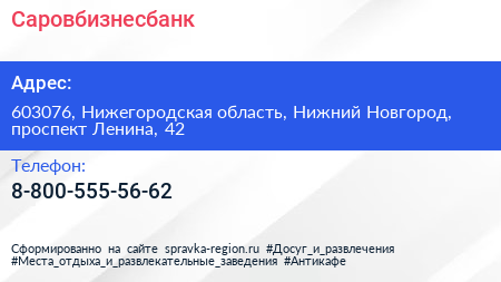 Саровбизнесбанк по адресу 603076, Нижегородская область, Нижний Новгород, проспект Ленина, 42 в дальнейшем Организация, размещена в следующих категориях: