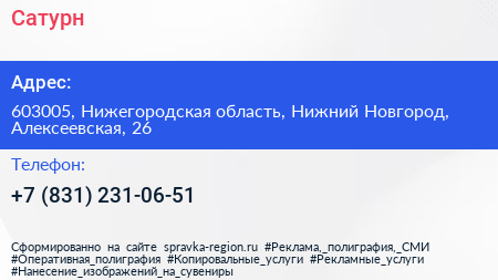 Сатурн по адресу 603005, Нижегородская область, Нижний Новгород, Алексеевская, 26 в дальнейшем Организация, размещена в следующих категориях: