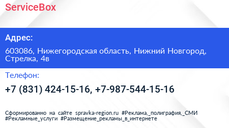 ServiceBox по адресу 603086, Нижегородская область, Нижний Новгород, Стрелка, 4в в дальнейшем Организация, размещена в следующих категориях: