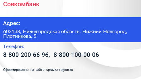 Совкомбанк по адресу 603138, Нижегородская область, Нижний Новгород, Плотникова, 5 в дальнейшем Организация, размещена в следующих категориях: