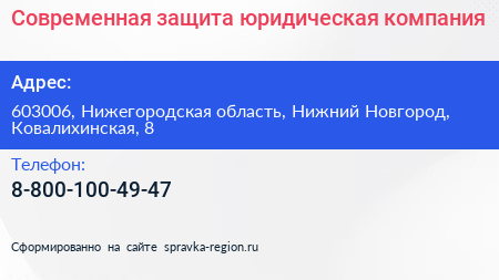 Современная защита, юридическая компания по адресу 603006, Нижегородская область, Нижний Новгород, Ковалихинская, 8 в дальнейшем Организация, размещена в следующих категориях: