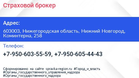 Страховой брокер по адресу 603003, Нижегородская область, Нижний Новгород, Коминтерна, 258 в дальнейшем Организация, размещена в следующих категориях:
