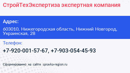СтройТехЭкспертиза, экспертная компания по адресу 603010, Нижегородская область, Нижний Новгород, Украинская, 28 в дальнейшем Организация, размещена в следующих категориях: