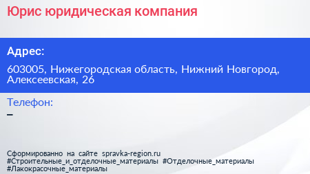Юрис, юридическая компания по адресу 603005, Нижегородская область, Нижний Новгород, Алексеевская, 26 в дальнейшем Организация, размещена в следующих категориях: