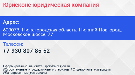 Юрисконс, юридическая компания по адресу 603079, Нижегородская область, Нижний Новгород, Московское шоссе, 77 в дальнейшем Организация, размещена в следующих категориях: