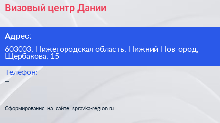 Визовый центр Дании по адресу 603003, Нижегородская область, Нижний Новгород, Щербакова, 15 в дальнейшем Организация, размещена в следующих категориях: