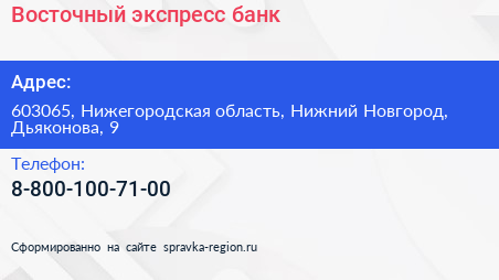 Восточный экспресс банк по адресу 603065, Нижегородская область, Нижний Новгород, Дьяконова, 9 в дальнейшем Организация, размещена в следующих категориях: