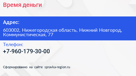 Время деньги по адресу 603002, Нижегородская область, Нижний Новгород, Коммунистическая, 77 в дальнейшем Организация, размещена в следующих категориях: