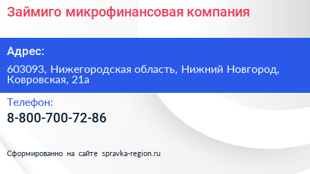 Займиго, микрофинансовая компания по адресу 603093, Нижегородская область, Нижний Новгород, Ковровская, 21а в дальнейшем Организация, размещена в следующих категориях: