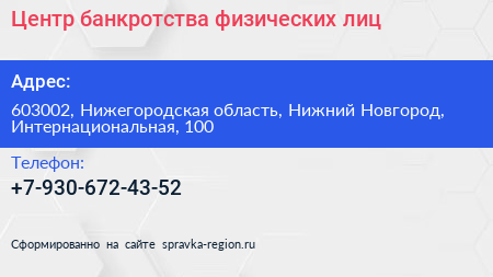Центр банкротства физических лиц по адресу 603002, Нижегородская область, Нижний Новгород, Интернациональная, 100 в дальнейшем Организация, размещена в следующих категориях: