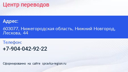 Центр переводов по адресу 603077, Нижегородская область, Нижний Новгород, Лескова, 44 в дальнейшем Организация, размещена в следующих категориях: