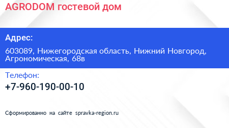 AGRODOM, гостевой дом по адресу 603089, Нижегородская область, Нижний Новгород, Агрономическая, 68в в дальнейшем Организация, размещена в следующих категориях: