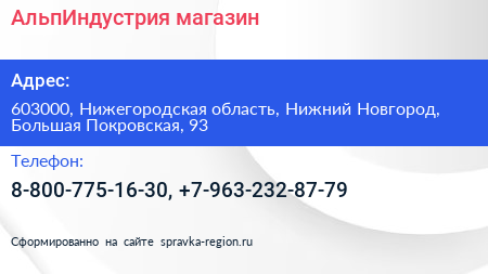 АльпИндустрия, магазин по адресу 603000, Нижегородская область, Нижний Новгород, Большая Покровская, 93 в дальнейшем Организация, размещена в следующих категориях: