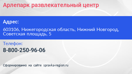 Арлепарк, развлекательный центр по адресу 603106, Нижегородская область, Нижний Новгород, Советская площадь, 5 в дальнейшем Организация, размещена в следующих категориях: