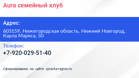 Aura, семейный клуб по адресу 603159, Нижегородская область, Нижний Новгород, Карла Маркса, 50 в дальнейшем Организация, размещена в следующих категориях: