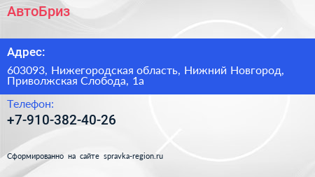 АвтоБриз по адресу 603093, Нижегородская область, Нижний Новгород, Приволжская Слобода, 1а в дальнейшем Организация, размещена в следующих категориях: