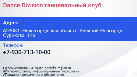 Dance Division, танцевальный клуб по адресу 603081, Нижегородская область, Нижний Новгород, Сурикова, 14а в дальнейшем Организация, размещена в следующих категориях:
