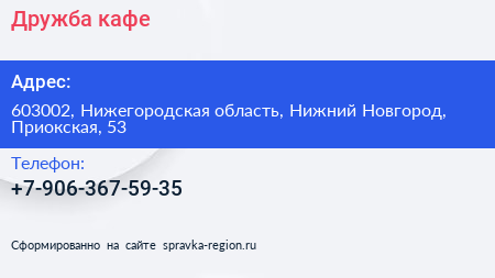 Дружба, кафе по адресу 603002, Нижегородская область, Нижний Новгород, Приокская, 53 в дальнейшем Организация, размещена в следующих категориях: