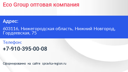 Eco-Group, оптовая компания по адресу 603116, Нижегородская область, Нижний Новгород, Гордеевская, 75 в дальнейшем Организация, размещена в следующих категориях: