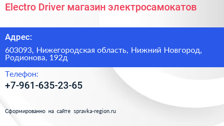 Electro Driver, магазин электросамокатов по адресу 603093, Нижегородская область, Нижний Новгород, Родионова, 192д в дальнейшем Организация, размещена в следующих категориях: