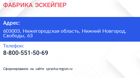 ФАБРИКА ЭСКЕЙПЕР по адресу 603003, Нижегородская область, Нижний Новгород, Свободы, 63 в дальнейшем Организация, размещена в следующих категориях: