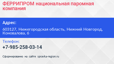 ФЕРРИПРОМ, национальная паромная компания по адресу 603127, Нижегородская область, Нижний Новгород, Коновалова, 6 в дальнейшем Организация, размещена в следующих категориях: