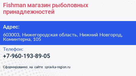 Fishman, магазин рыболовных принадлежностей по адресу 603003, Нижегородская область, Нижний Новгород, Коминтерна, 105 в дальнейшем Организация, размещена в следующих категориях: