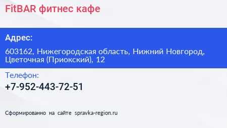FitBAR, фитнес-кафе по адресу 603162, Нижегородская область, Нижний Новгород, Цветочная (Приокский), 12 в дальнейшем Организация, размещена в следующих категориях: