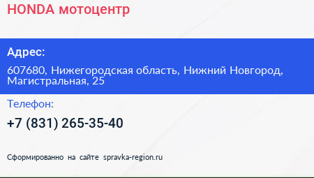 HONDA, мотоцентр по адресу 607680, Нижегородская область, Нижний Новгород, Магистральная, 25 в дальнейшем Организация, размещена в следующих категориях: