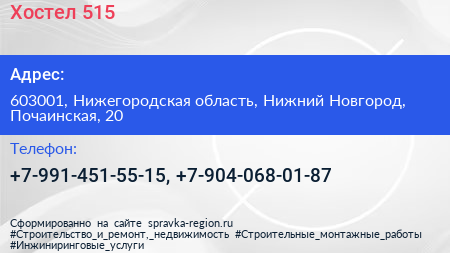Хостел 515 по адресу 603001, Нижегородская область, Нижний Новгород, Почаинская, 20 в дальнейшем Организация, размещена в следующих категориях: