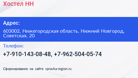 Хостел-НН по адресу 603002, Нижегородская область, Нижний Новгород, Советская, 20 в дальнейшем Организация, размещена в следующих категориях: