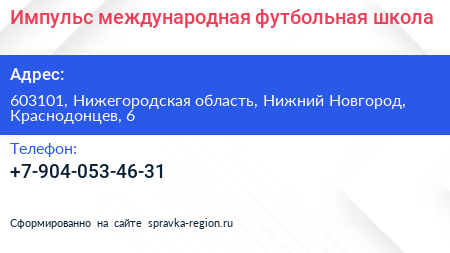 Импульс, международная футбольная школа по адресу 603101, Нижегородская область, Нижний Новгород, Краснодонцев, 6 в дальнейшем Организация, размещена в следующих категориях: