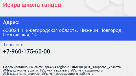 Искра, школа танцев по адресу 603024, Нижегородская область, Нижний Новгород, Полтавская, 14 в дальнейшем Организация, размещена в следующих категориях:
