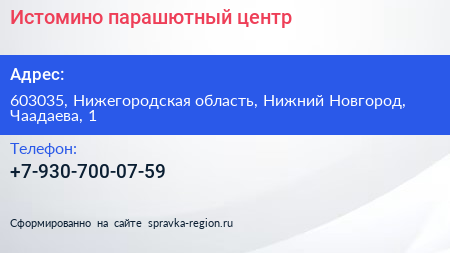 Истомино, парашютный центр по адресу 603035, Нижегородская область, Нижний Новгород, Чаадаева, 1 в дальнейшем Организация, размещена в следующих категориях: