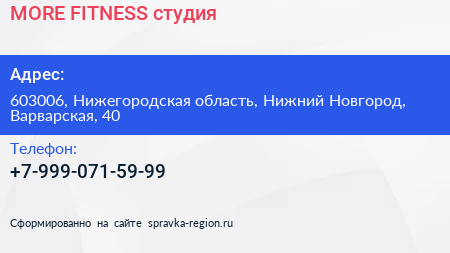 MORE FITNESS, студия по адресу 603006, Нижегородская область, Нижний Новгород, Варварская, 40 в дальнейшем Организация, размещена в следующих категориях: