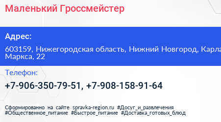 Маленький Гроссмейстер по адресу 603159, Нижегородская область, Нижний Новгород, Карла Маркса, 22 в дальнейшем Организация, размещена в следующих категориях: