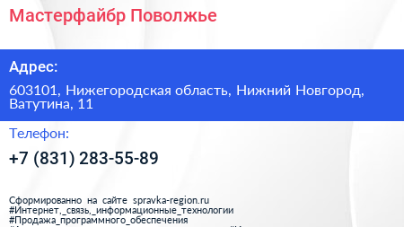 Мастерфайбр Поволжье по адресу 603101, Нижегородская область, Нижний Новгород, Ватутина, 11 в дальнейшем Организация, размещена в следующих категориях: