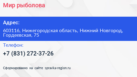 Мир рыболова по адресу 603116, Нижегородская область, Нижний Новгород, Гордеевская, 75 в дальнейшем Организация, размещена в следующих категориях: